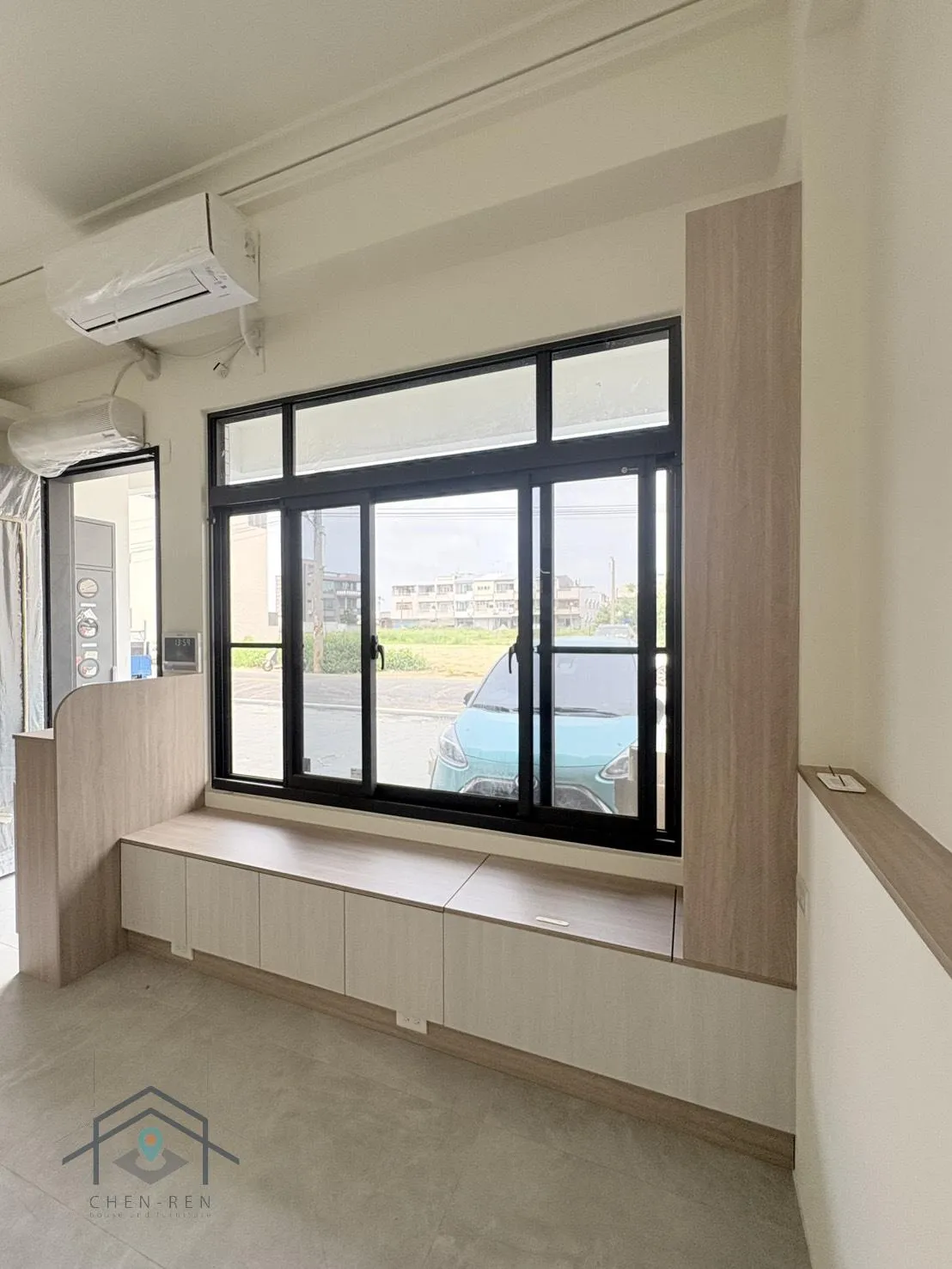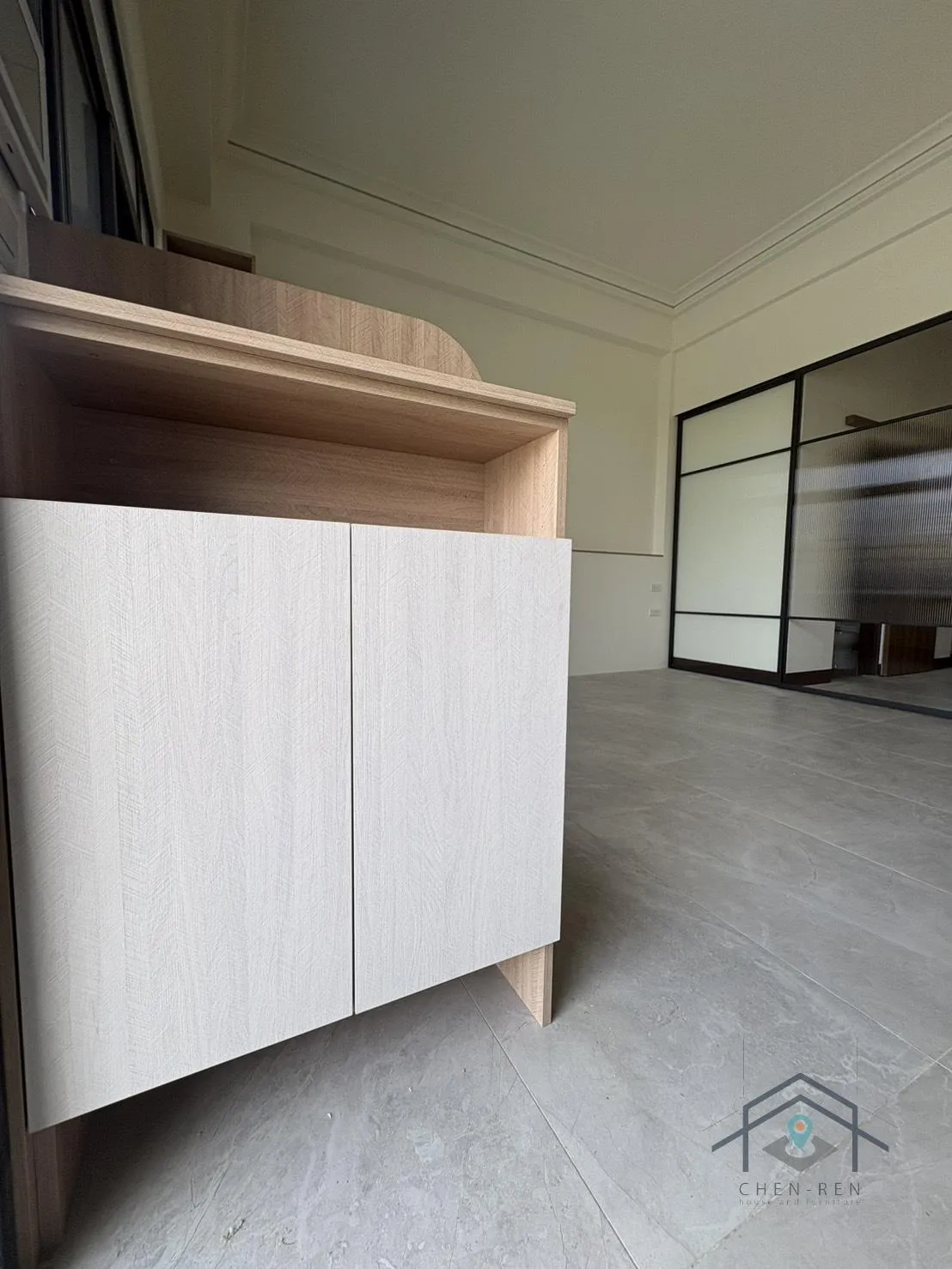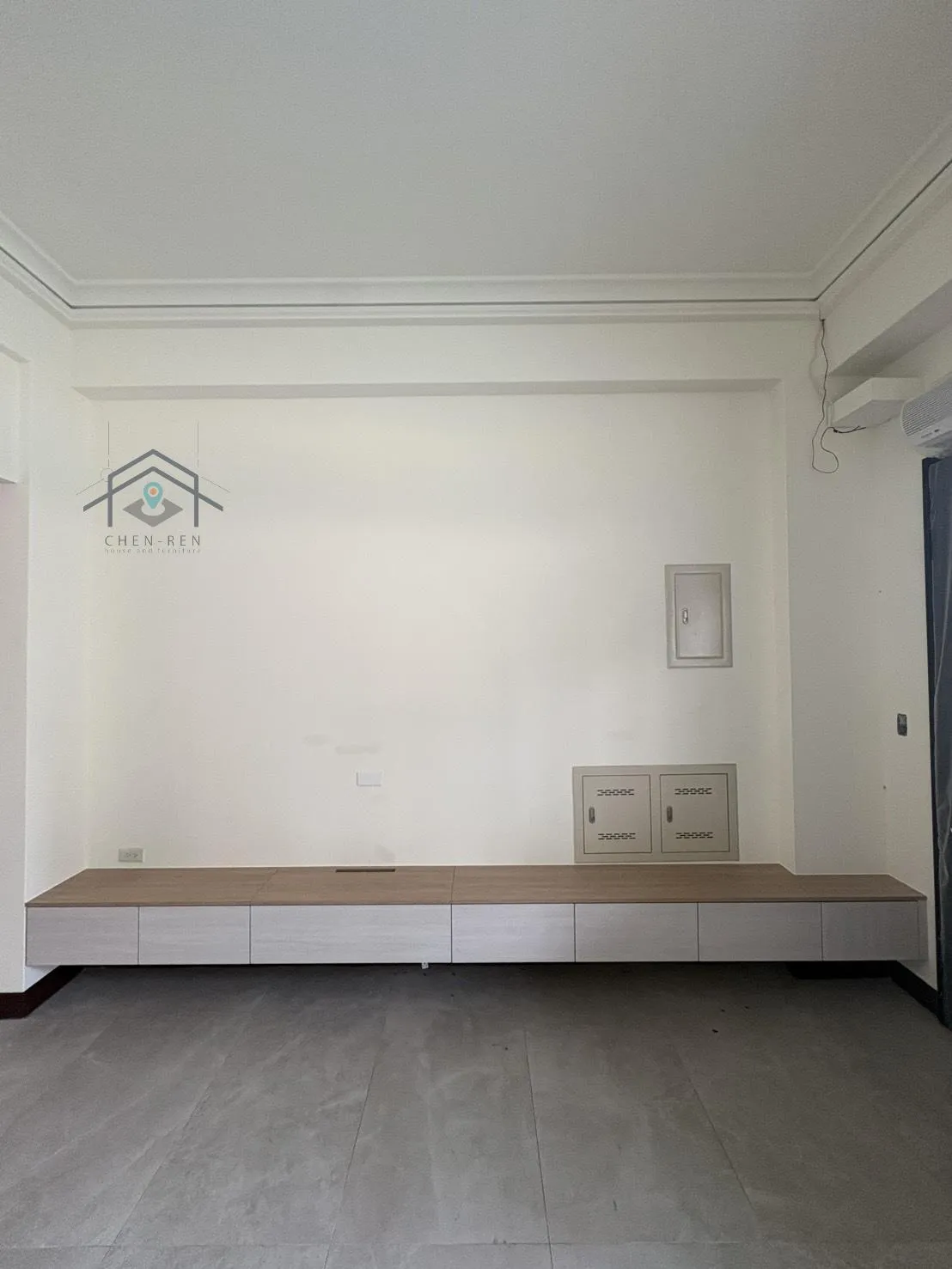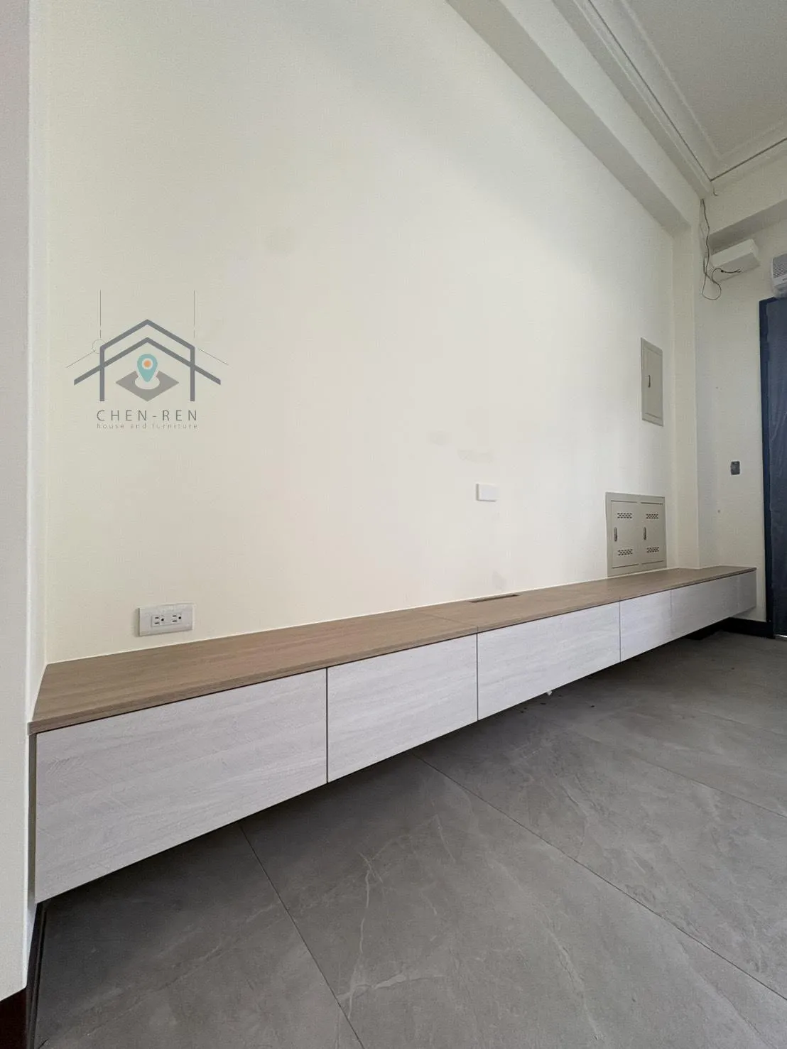 電視下櫃台面-金橡木;電視下櫃櫃體-白雲岩